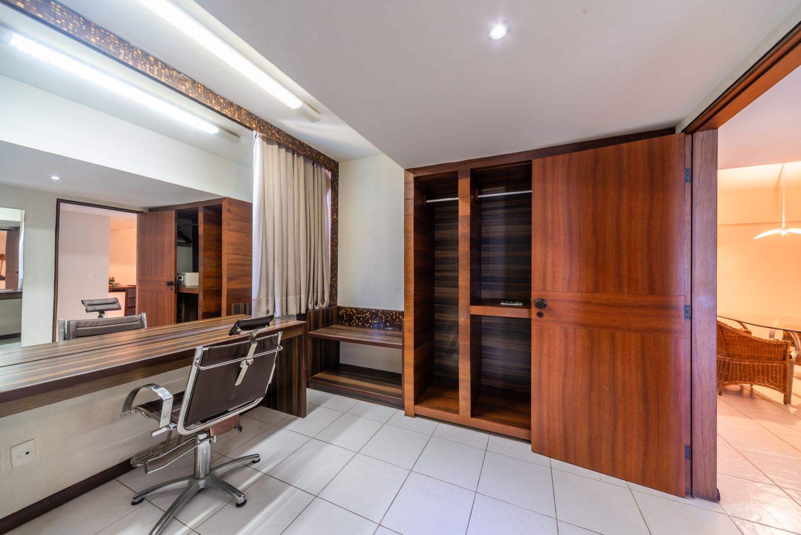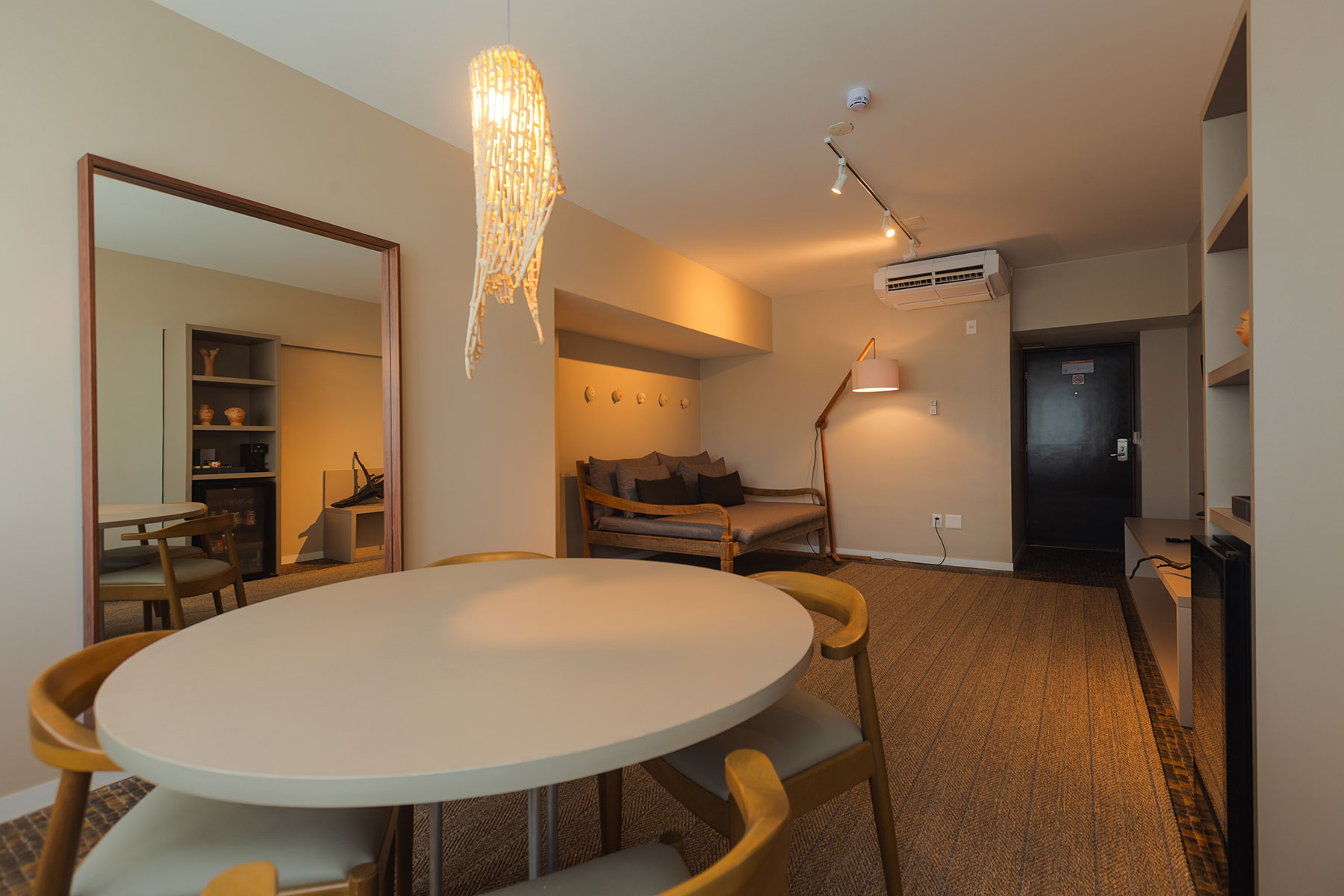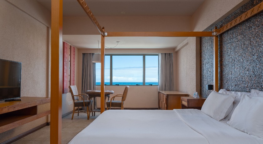 Visando oferecer para o mercado corporativo uma opção de alto padrão e luxo, a suíte possui 120m², duas portas de entrada com hall, sala com dois sofás, uma sala de reunião para até 12 pessoas, closet, banheiro com ofurô japonês de madeira e dois chuveiros, cama king size, adega de vinhos climatizada e uma varanda com uma bela vista para o mar.